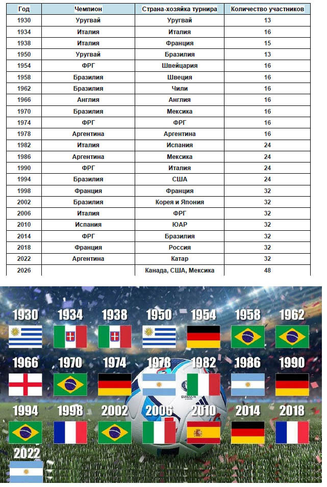 ЧМ-1930, ЧМ-1934, ЧМ-1938, ЧМ-1950, ЧМ-1954, ЧМ-1958, ЧМ-1962, ЧМ-1966, ЧМ-1970, ЧМ-1974, ЧМ-1978, ЧМ-1982, ЧМ-1986, ЧМ-1990, ЧМ-1994, ЧМ-1998, ЧМ-2002, ЧМ-2006, ЧМ-2010, ЧМ-2014, ЧМ-2018, ЧМ-2022.
